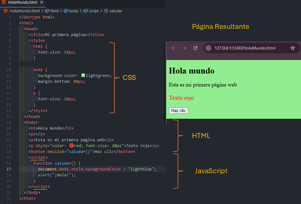 Al hacer clic en el botón, cambia dinámicamente el color del fondo de la pagina web y aparece el mensaje “¡Hola!”. Eso es JavaScript en acción.